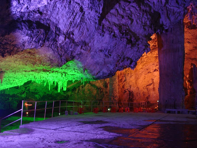 九天洞圖片 九天洞四絕: 第一絕:九天洞大 九天洞總面積250多萬平方米,折合4萬多畝。這樣一個(gè)大溶洞,比堪稱世界第一洞的利川溶洞還大3倍。據(jù)《環(huán)球天然奇觀》一書介紹,南斯拉夫的波斯托伊納大巖洞與美國的巴哈馬大藍(lán)洞,都稱為“世界上最大的洞”,還有古巴的貝拉雅馬爾大巖洞與我國貴州、湖北神農(nóng)架一些溶洞,也都被稱為“世界或中國最大的溶洞”。可是這些溶洞,同九天洞比較,都會(huì)感到遜色不少。1988年,中國科學(xué)地質(zhì)研究所巖溶與地下水研究室主任張壽越教授兩次來九天洞考察,他認(rèn)為該洞是亞洲第一大洞,于是他給九天洞題詞:“滴石鑄玄女,暗河鏤九天”。1988年9月下旬,來自美國、英國與比利時(shí)的15位洞穴專家對(duì)九天洞作深入研究,連續(xù)7天7夜住在洞內(nèi)全面考察。通過考察,他們一致認(rèn)為九天洞是世界奇跡,不僅具有很高的旅游價(jià)值,同時(shí)還有很高的科研價(jià)值。