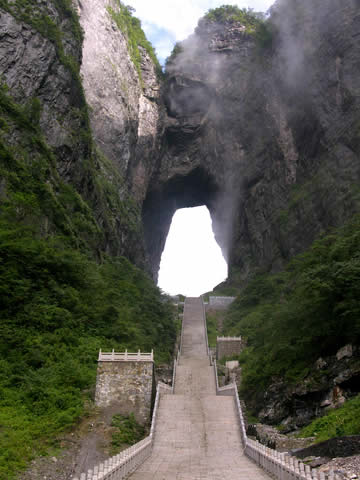 | 天門洞是天門山最具有代表意義的景點,它位于天門山山體的中上部,海拔1300米,門高131.5米,寬57米,深60米,是世界上最高海拔的天然穿山溶洞。
