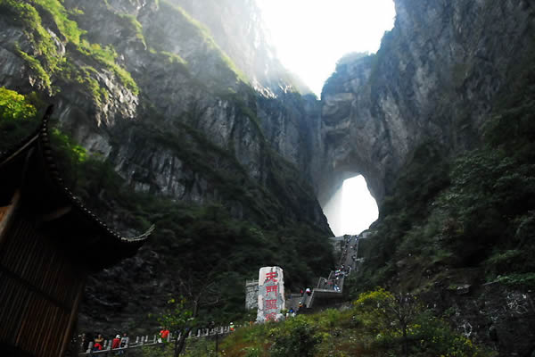 天門洞風光圖片 天門洞景觀 1700多年來,這一道奇絕天下的勝景吸引著無數(shù)的探訪者趨之若鶩。特別是在1999年,世界特技飛行大師駕機穿越天門洞,在全球引發(fā)了轟動效應,收看現(xiàn)場直播的觀眾達到8億之多。