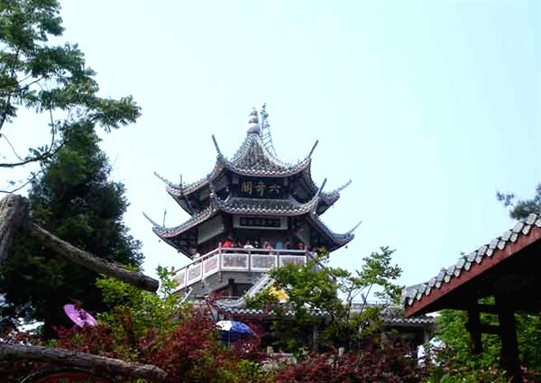 | 六奇閣位于張家界森林公園黃石寨項的人工建筑。因張家界國家森林公園”山奇、水奇、云奇、石奇.樹奇以及珍禽異獸之奇”而得名。閣分3層,黃瓦蓋頂,飛檐翹角,畫梁彩棟,回廊石欄。登閣憑眺,滿目佳景。閣柱楹聯(lián)日:“翠鬟煙籠,綠樹云封.昔日曾遮半個面:麗質(zhì)天生,畫圖省識,今朝始醉四方人!庇忠宦(lián)云“名動全球,到此實堪三擊掌:勢拔五岳,歸來不用再看山!遍w內(nèi)設有土家風情歌舞樓.竟日絲竹弦管,清音繞梁。閣基嵌有《張家界國家森林公園記》全文碑刻。1995年9月8日.全國政協(xié)主席李瑞環(huán)登閣賞景。
