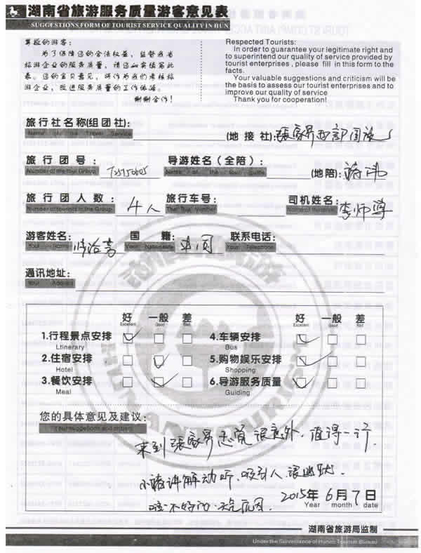 5月下旬,上海張女士一行四位貴賓與湖南西部(張家界)中國國際旅行社工作人員——龔玲取得聯(lián)系,經(jīng)過商談,雙方達成協(xié)議并簽訂旅游合同,于6月4日抵達張家界,開始張家界之旅。此次行程是由我社優(yōu)秀導游——褚偉,負責旅游接待工作,褚導在旅游過程中講解詳細,客人也很滿意,在意見表上寫到:來到張家界感覺很意外,值得一行,小褚講解動聽,吸引人,很幽默!同時也感謝張女士選擇湖南西部(張家界)中國國際旅行社,以及您對湖南西部國旅的信任與支持。我們會繼續(xù)努力,做好旅游接待工作。期待下一次與您的合作,祝您愉快!